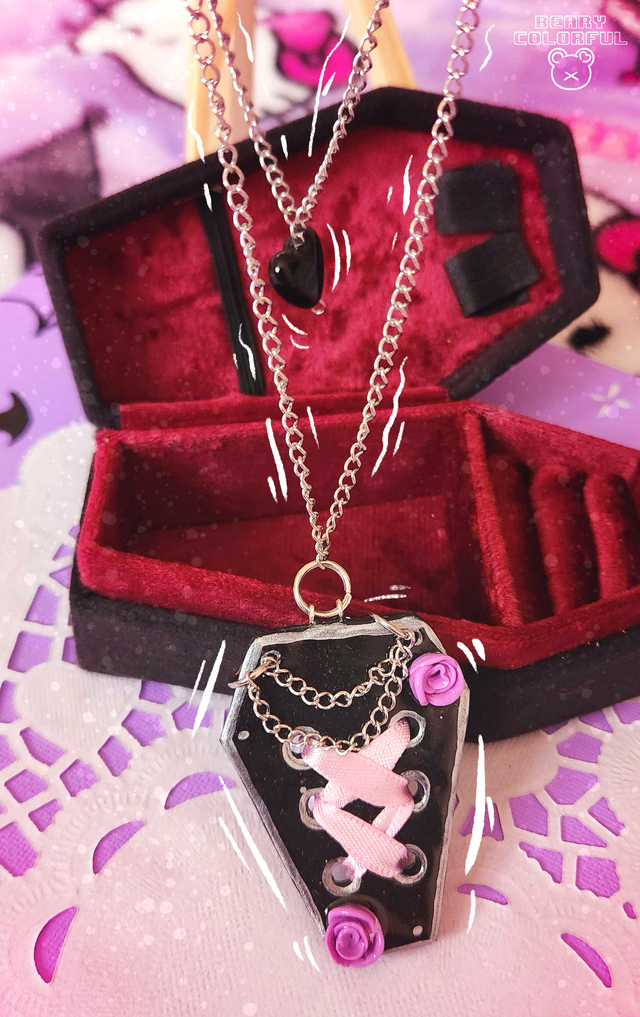 Collier goth kawaii - pastel goth -- Cercueil style corset avec chaînettes et roses 🦇 Réalisé en argile polymère, peint à la main et protégé par de la résine UV - VERSION VIOLET