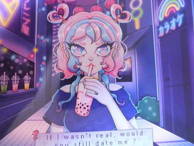 Impression de mon illustration "Bubble tea" inspirée des visual novels et du paysage urbain japonais. Impression sur papier photo brillant