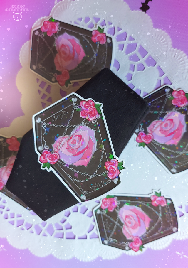 🌹 Sticker cercueil gothique avec des chaînes et des roses ~ Dessin réalisé sur procreate, imprimé sur papier autocollant et protégé par un laminage holographique ✨