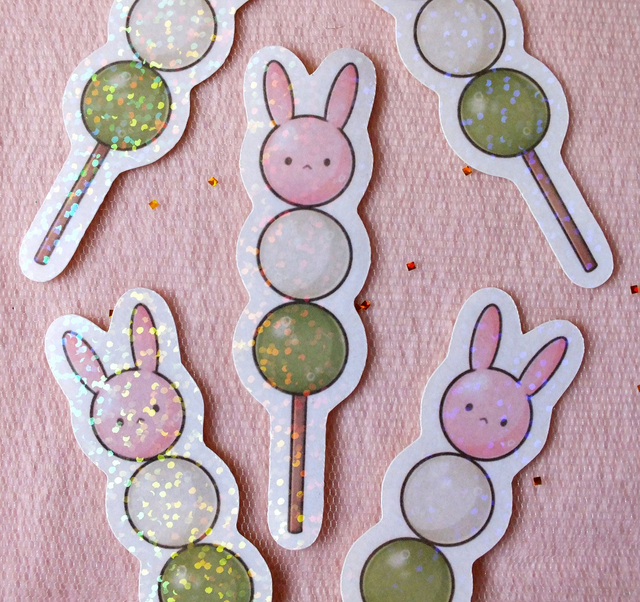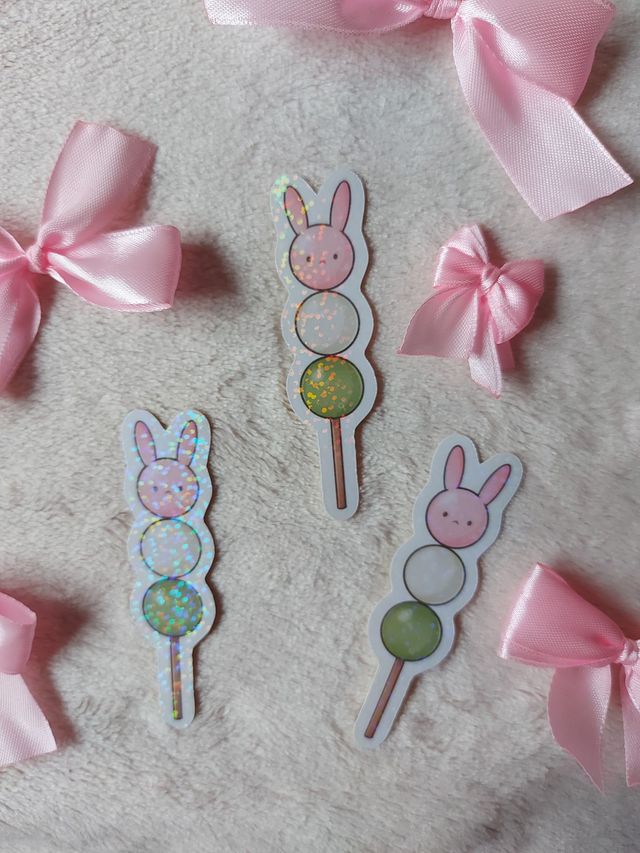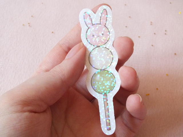 Sticker Dango 3 couleurs lapin laminé à froid avec un film pailleté holographique qui le protège de l'eau