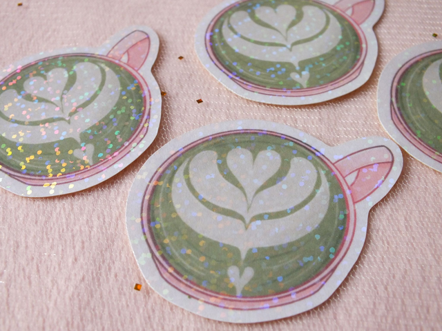 Sticker Matcha Latte laminé à froid avec un film pailleté holographique qui le protège de l'eau